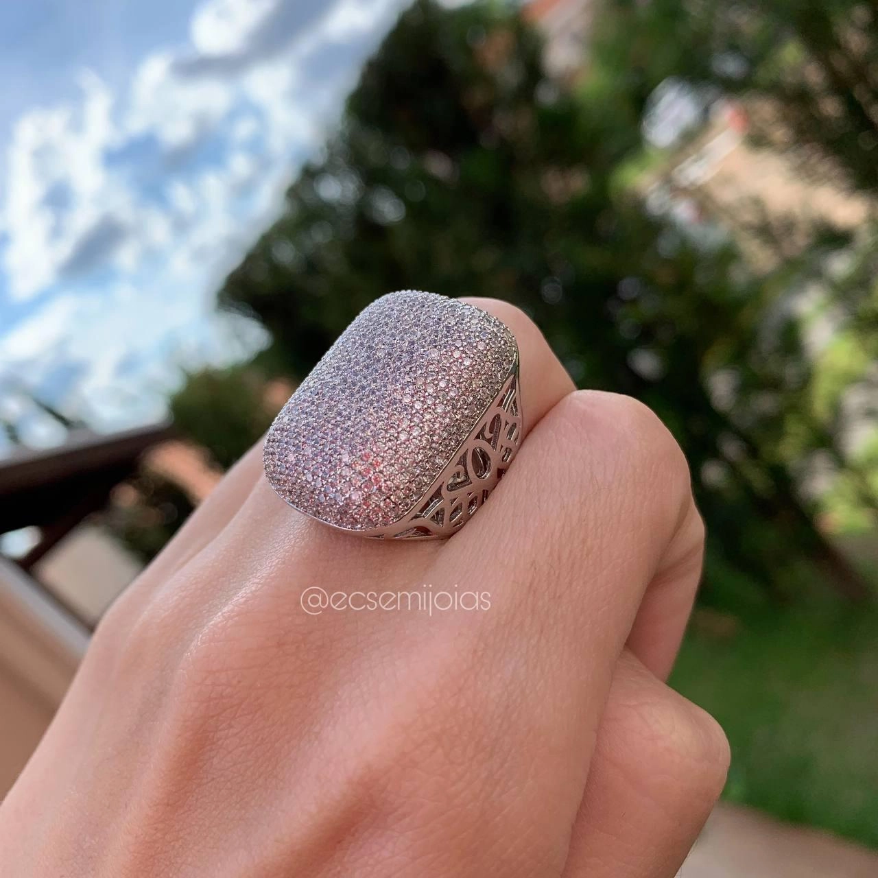 Anel almofada quadrado cravejado com aro vazadoConfira opiniões e avaliações de clientes!