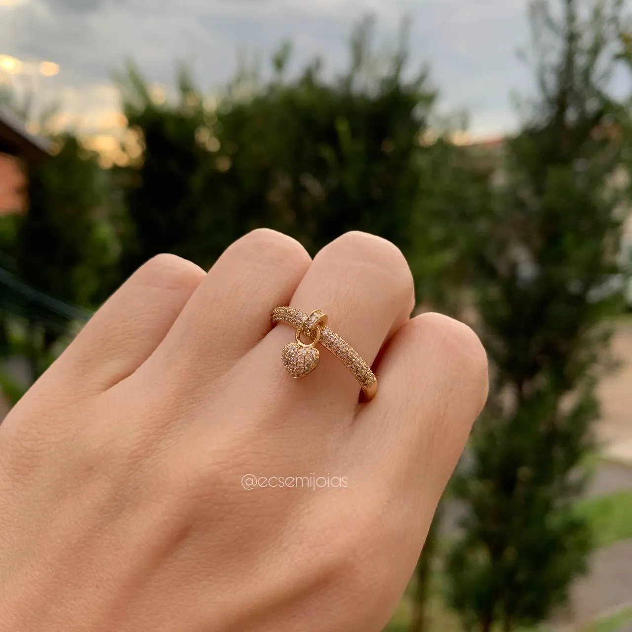 Anel cravejado com coração pendurado - banhado a ouro 18kConfira opiniões e avaliações de clientes!