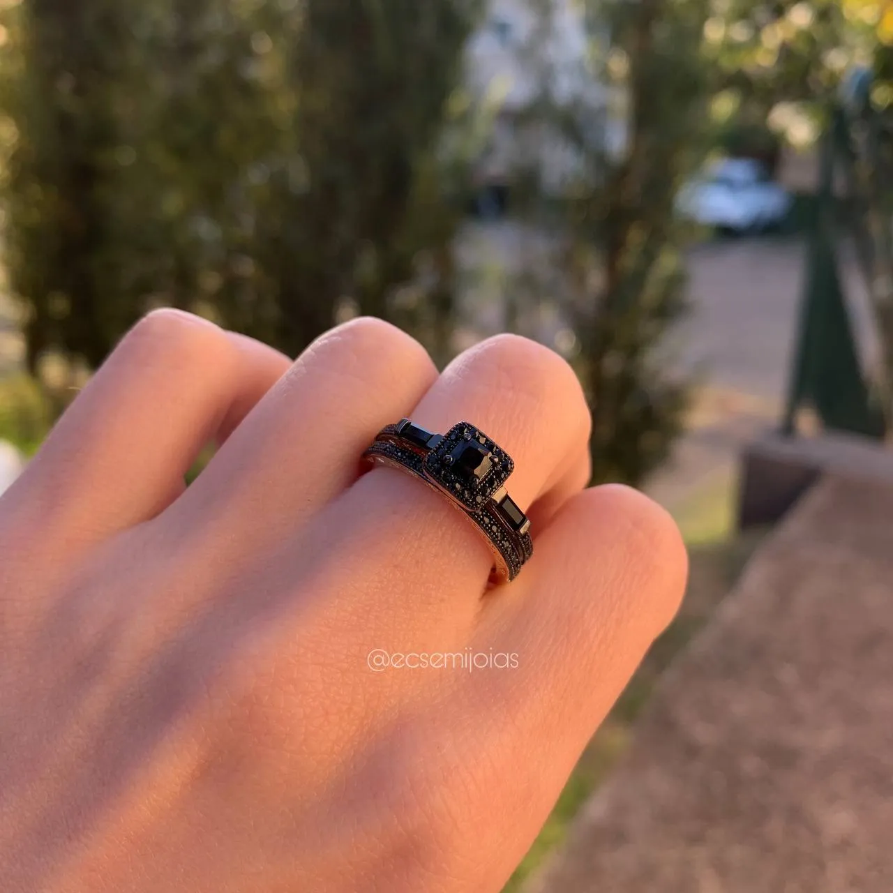 Anel duplo c/ quadrado cravejado ao centro duas zircônias baguete - banhado a ouro 18kConfira opiniões e avaliações de clientes!