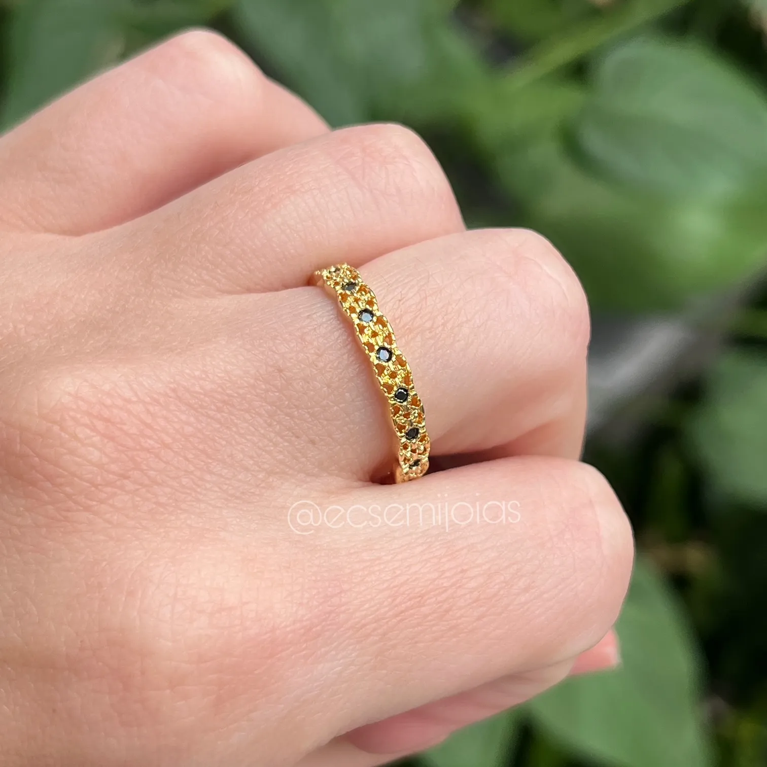 Anel fino trabalhado vazado com zircônias intercaladas - banhado a ouro 18kConfira opiniões e avaliações de clientes!