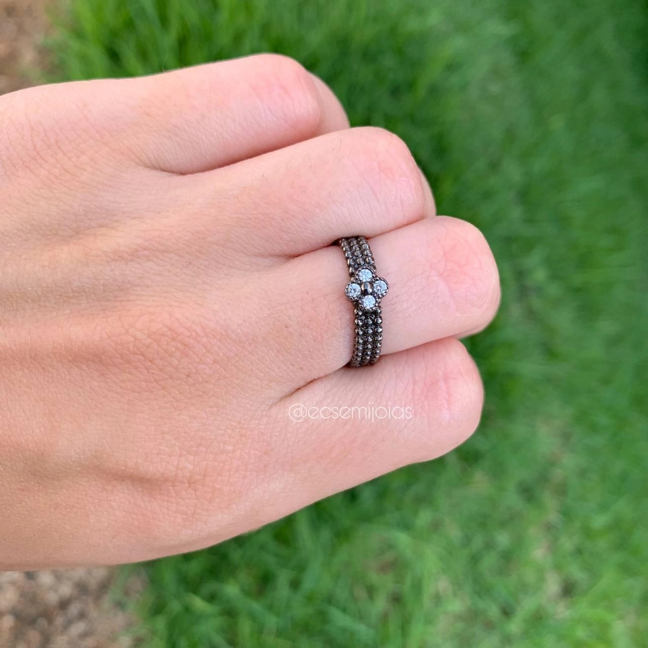 Anel flor cravejada centro aro bombardeado - banhado a ródio negroConfira opiniões e avaliações de clientes!