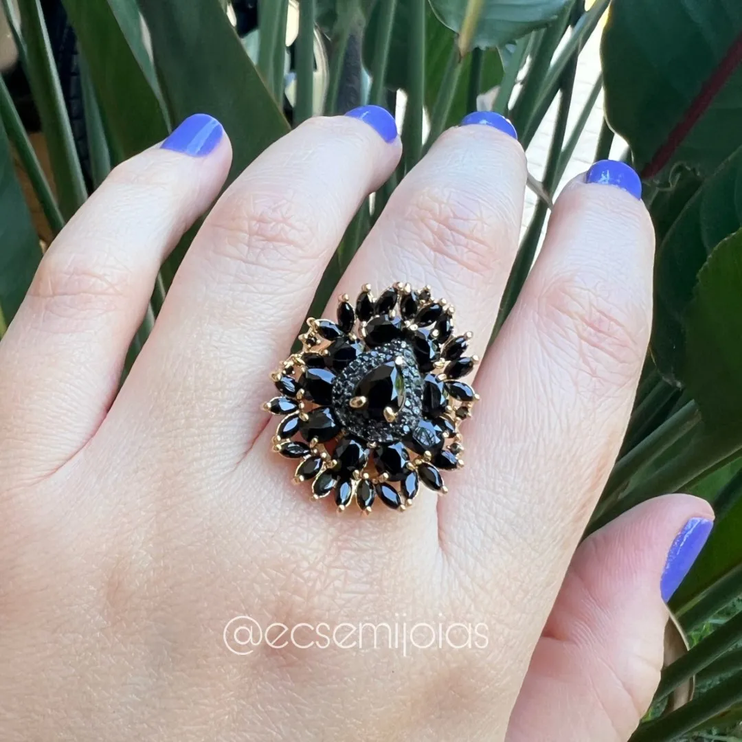 Anel gota com pedra maior no centro, cravejado em volta e bordas com gotas e navetes - banhado a ouro 18kConfira opiniões e avaliações de clientes!