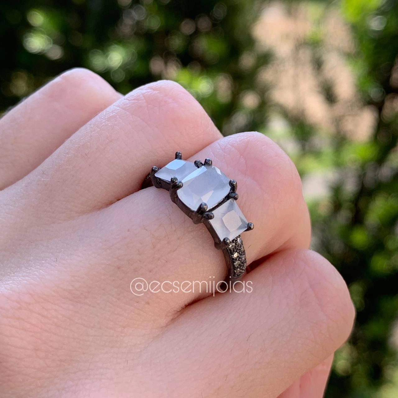 Anel pedra oval no centro e 2 quadradas uma de cada lado cravejado nas laterais zircônia brancaConfira opiniões e avaliações de clientes!