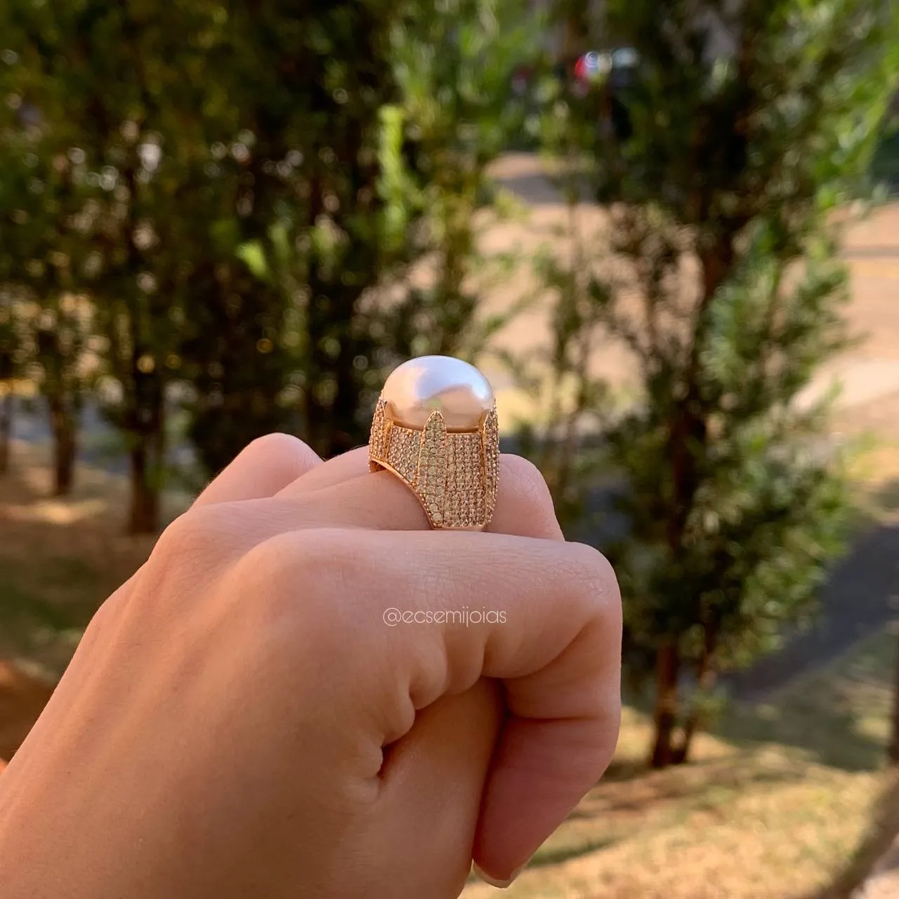 Anel perola grande em cima e aro todo cravejado na lateral - banhado a ouro 18kConfira opiniões e avaliações de clientes!