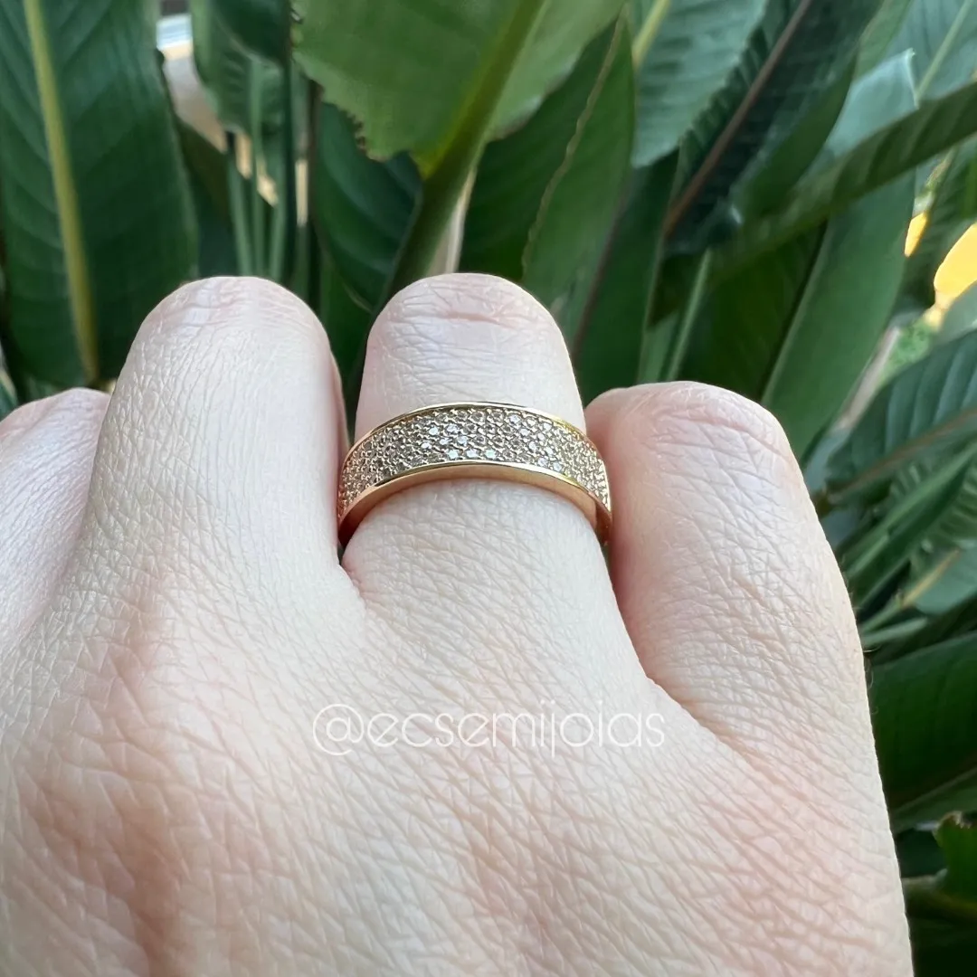 Anel retangular com 4 fileiras cravejadas em cima - banhado a ouro 18kConfira opiniões e avaliações de clientes!