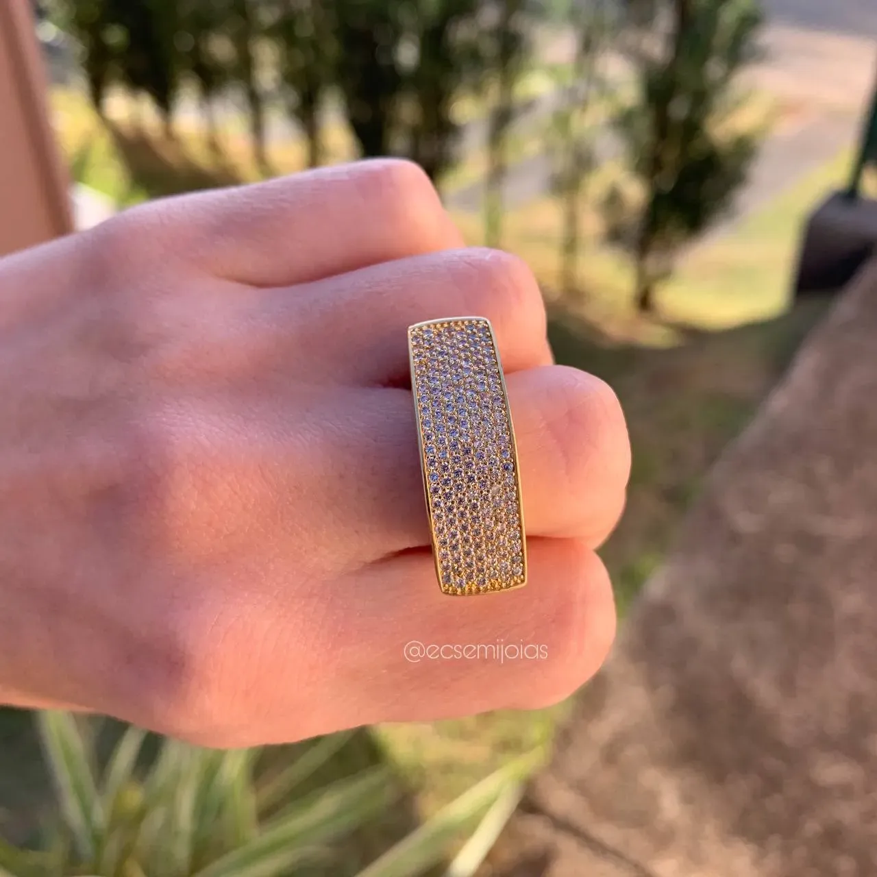 Anel retangulo comprido cravejado - banhado a ouro 18kConfira opiniões e avaliações de clientes!