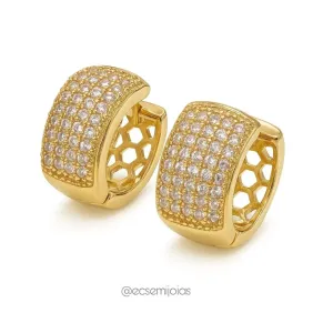 Argola cravejada com 2 fileiras com pedra em formato de dente de sabre com gota no centro - banhado a ouro 18kConfira opiniões e avaliações de clientes!