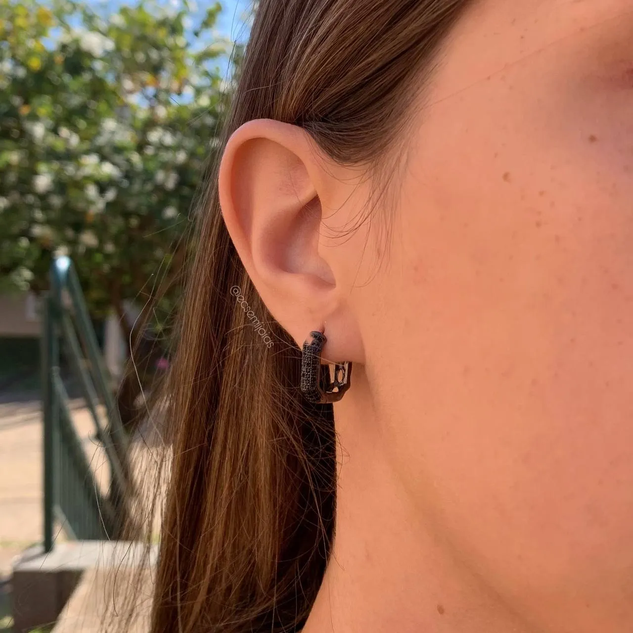 Brinco argola quadrada cravejada na frente e trabalho vazado atras com pedras e rodium negro - banhado a ródio negroConfira opiniões e avaliações de clientes!