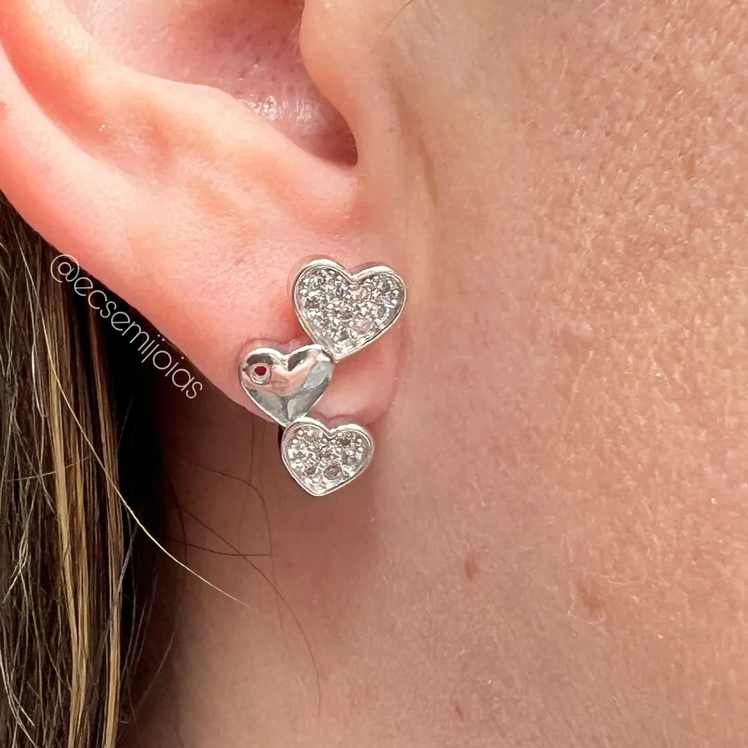 Brinco com 3 corações (2 cravejados e 1 liso) - banhado a ródio brancoConfira opiniões e avaliações de clientes!