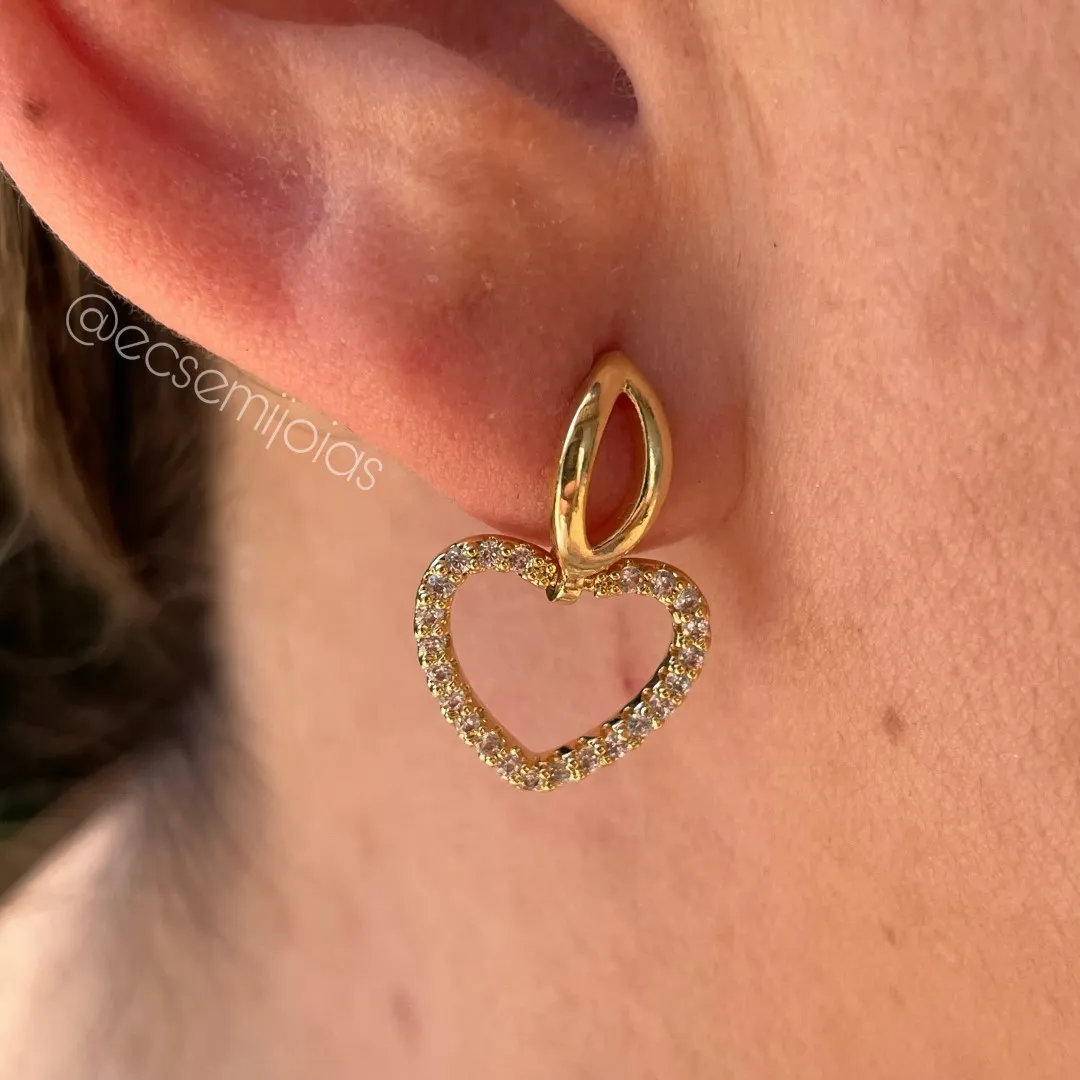 Brinco com base vazada e coração cravejado vazado - banhado a ouro 18kConfira opiniões e avaliações de clientes!