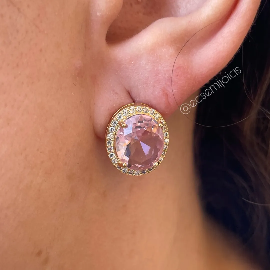 Brinco com zircônia oval grande 10x12mm no centro cravejado em volta - banhado a ouro 18kConfira opiniões e avaliações de clientes!