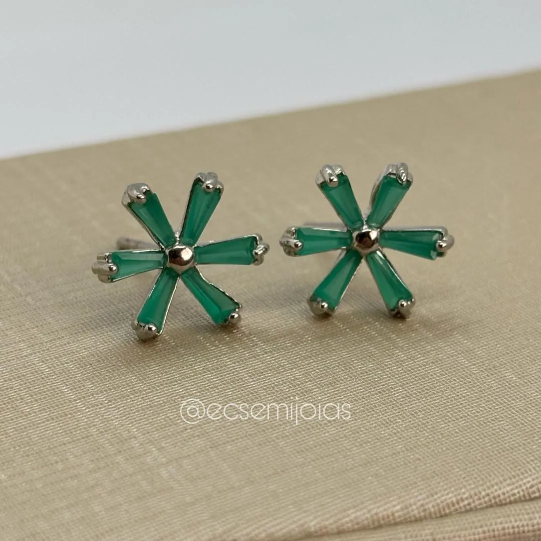 Brinco de flor com zircônias baguetes - banhado a ródio brancoConfira opiniões e avaliações de clientes!