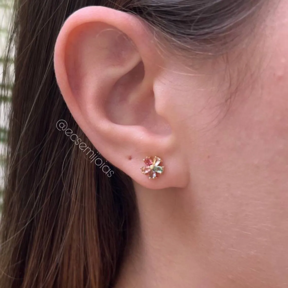 Brinco flor com zircônias baguetes P - 7mm - banhado a ouro 18kConfira opiniões e avaliações de clientes!