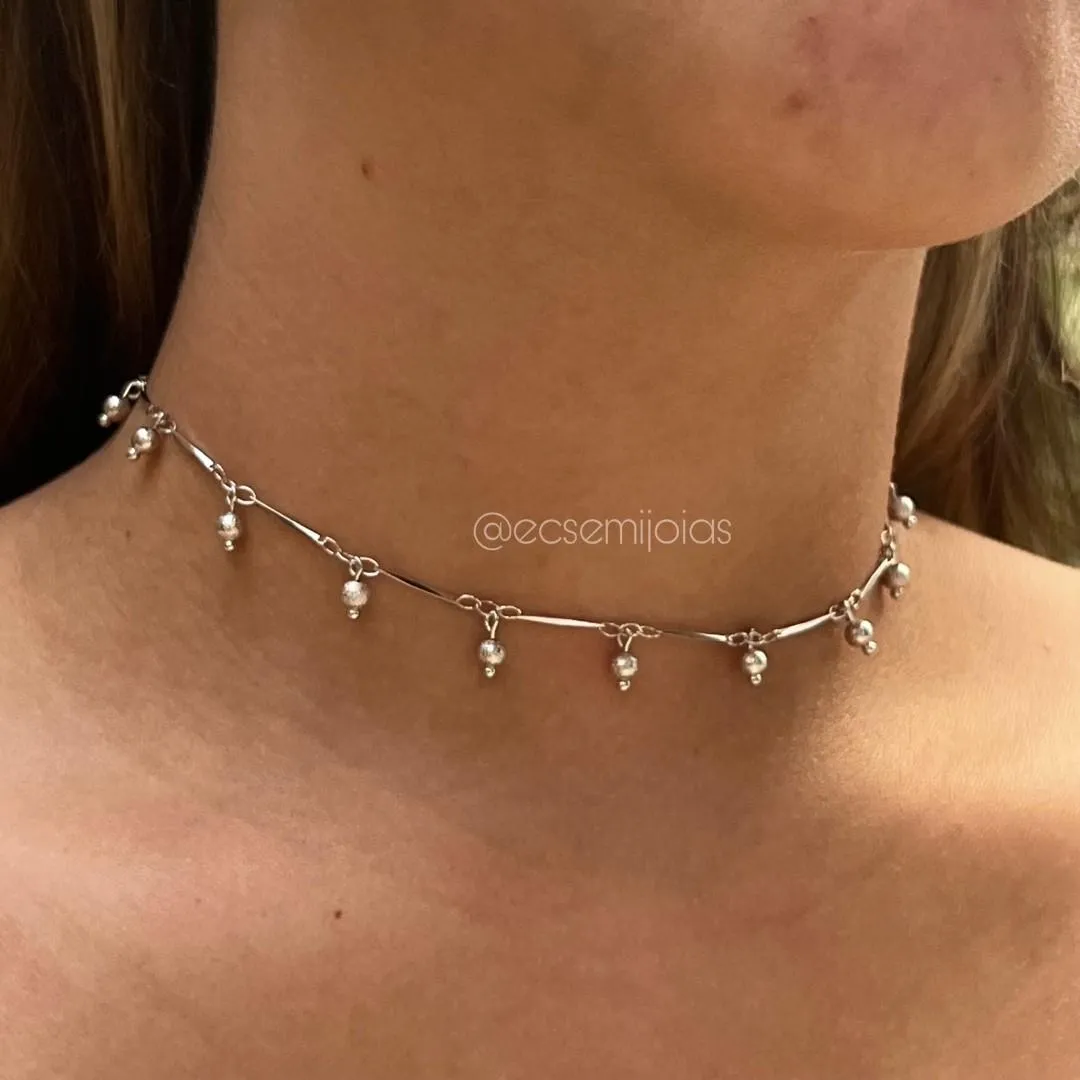 Choker com bastões e bolas diamantadas penduradas - 33cm + extensor - banhado a ródio brancoConfira opiniões e avaliações de clientes!