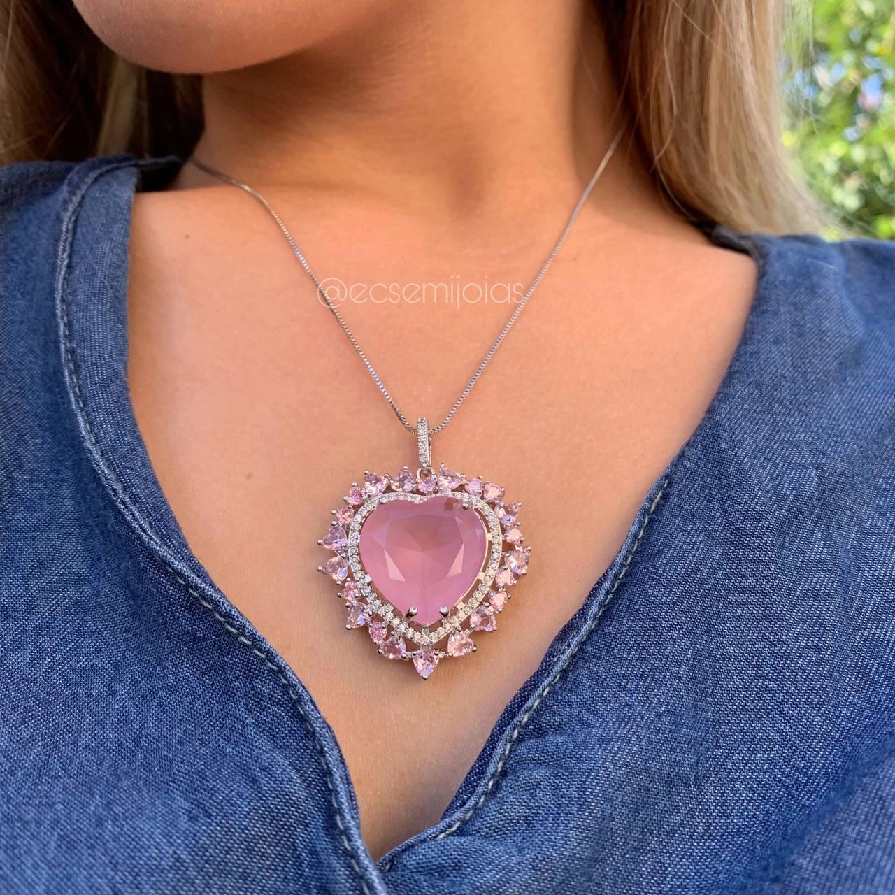 Colar de coração todo cravejado com pedra quartzo rosa banhado a ródio branco - 45cmConfira opiniões e avaliações de clientes!