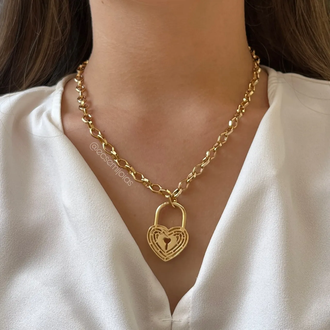 Colar de elos com cadeado - 45 cm - banhado a ouro 18kConfira opiniões e avaliações de clientes!