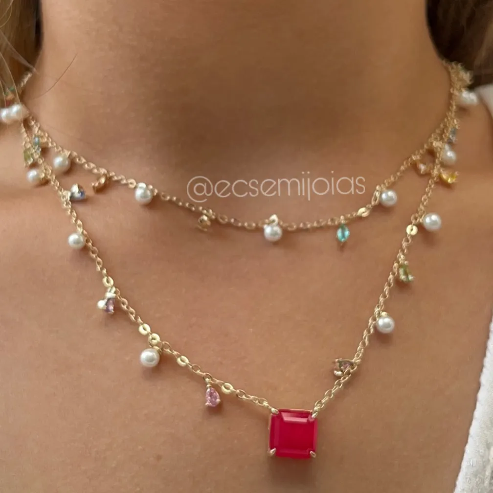 Conjunto brinco, colar com pedra quadrada com navetes e pérolas shell - 40 cm + extensor - banhado a ouro 18kConfira opiniões e avaliações de clientes!