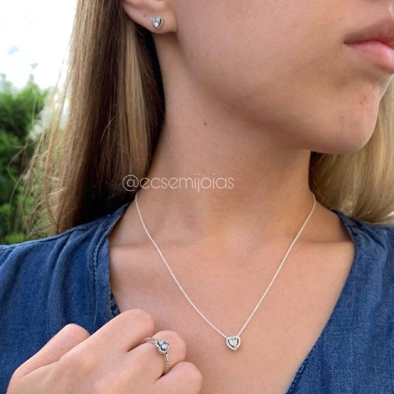 Conjunto brinco, colar e anel coração cravejado pequeno corrente 50cm - PRATA 925Confira opiniões e avaliações de clientes!