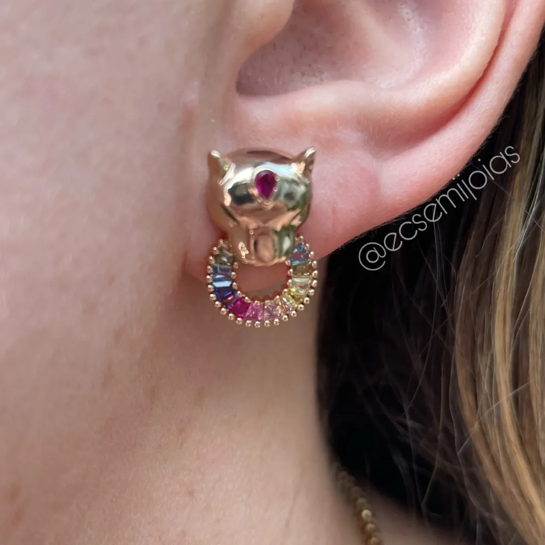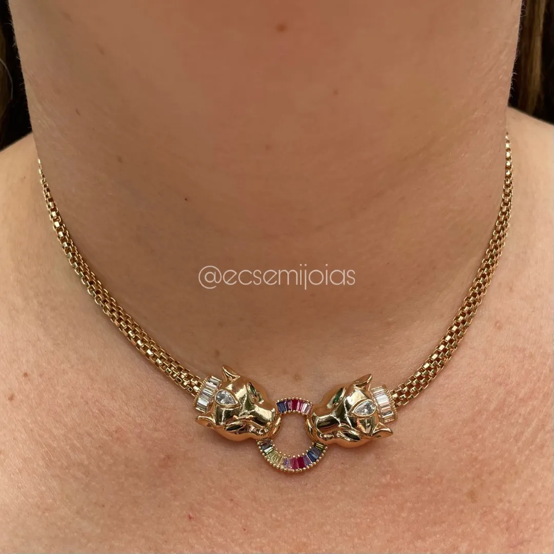 Conjunto de brinco e colar com cabeça de pantera com zircônias baguetes - banhado a ouro 18kConfira opiniões e avaliações de clientes!