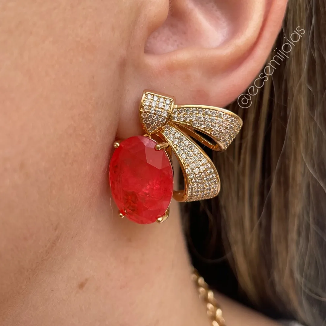 Conjunto de brinco e colar de gota de laço cravejado com pedra oval fusion pendurada - banhado a ouro 18kConfira opiniões e avaliações de clientes!