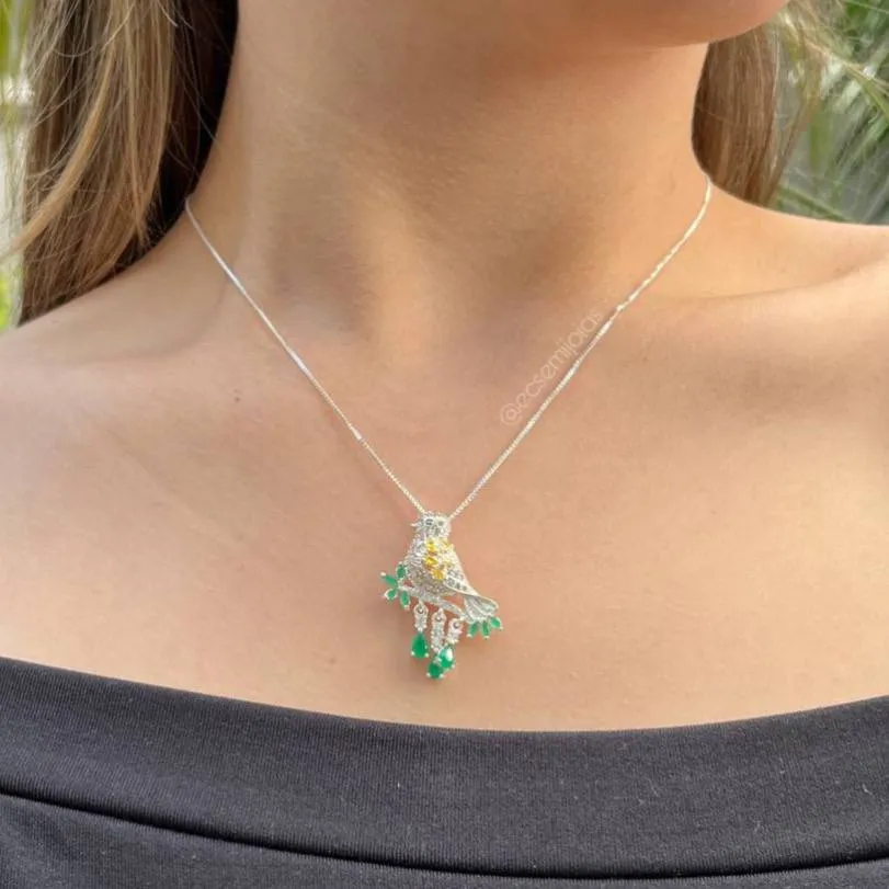 Conjunto de brinco e colar pássaro com galho pendurado cravejado com zircônias brancas, amarelas e esmeralda - Banhado ródio brancoConfira opiniões e avaliações de clientes!
