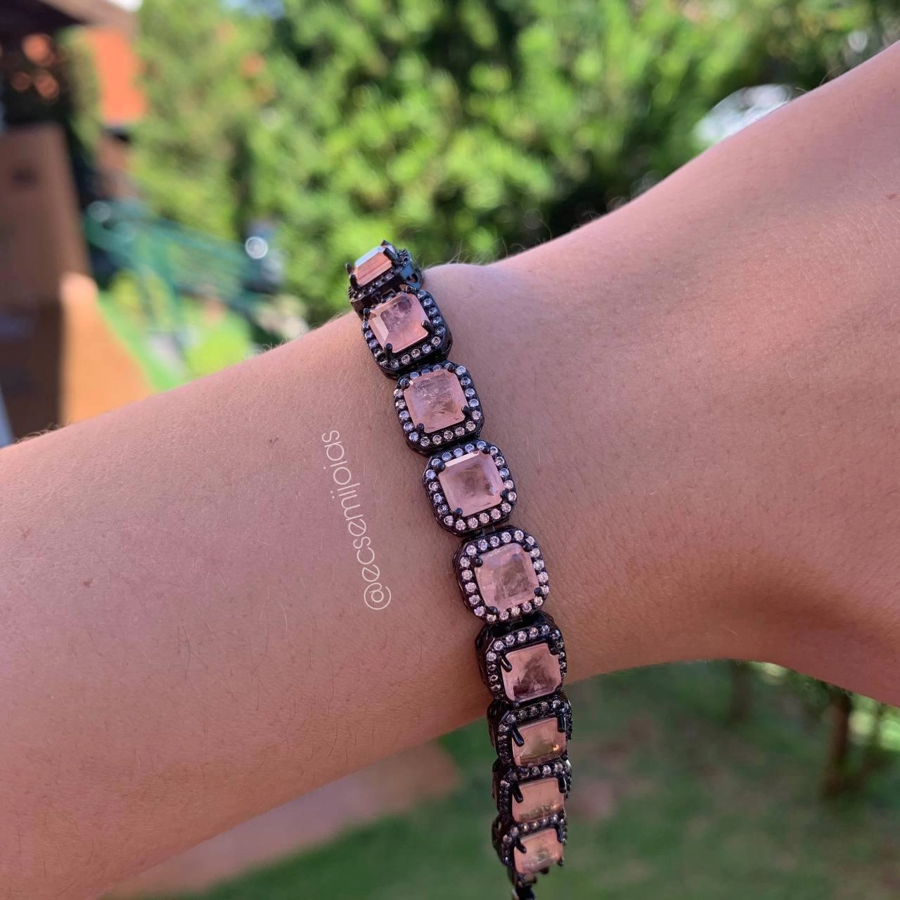 Pulseira 100% elos quadrados c/ pedra maior centro cravejado em volta banhado a ródio negroConfira opiniões e avaliações de clientes!