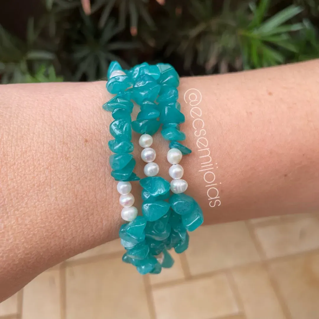 Pulseira com 3 fios com pedras de tamanhos variados e pérolas de água doce - 20cm - banhado a ouro 18kConfira opiniões e avaliações de clientes!
