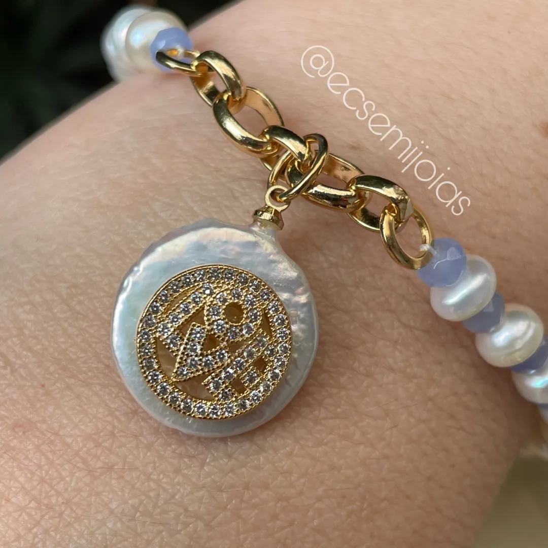 Pulseira com pingente em madrepérola com LOVE cravejado e pedras naturais redondas + pérolas de água doce - 19cm - banhado a ouro 18kConfira opiniões e avaliações de clientes!