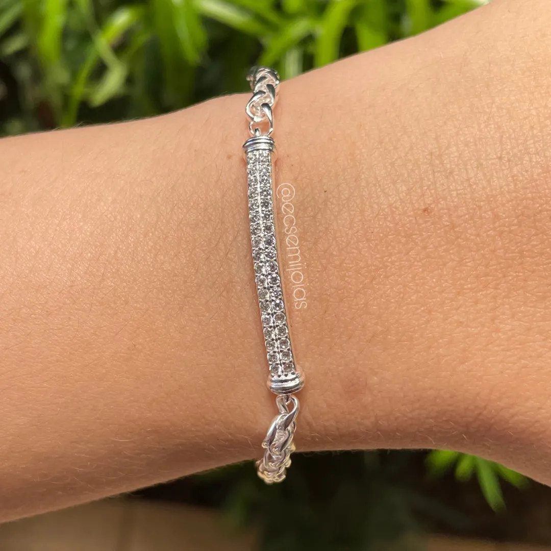 Pulseira de elo palmeira com tubo retangular cravejado - 18cm + extensor - banhado a prata 925Confira opiniões e avaliações de clientes!