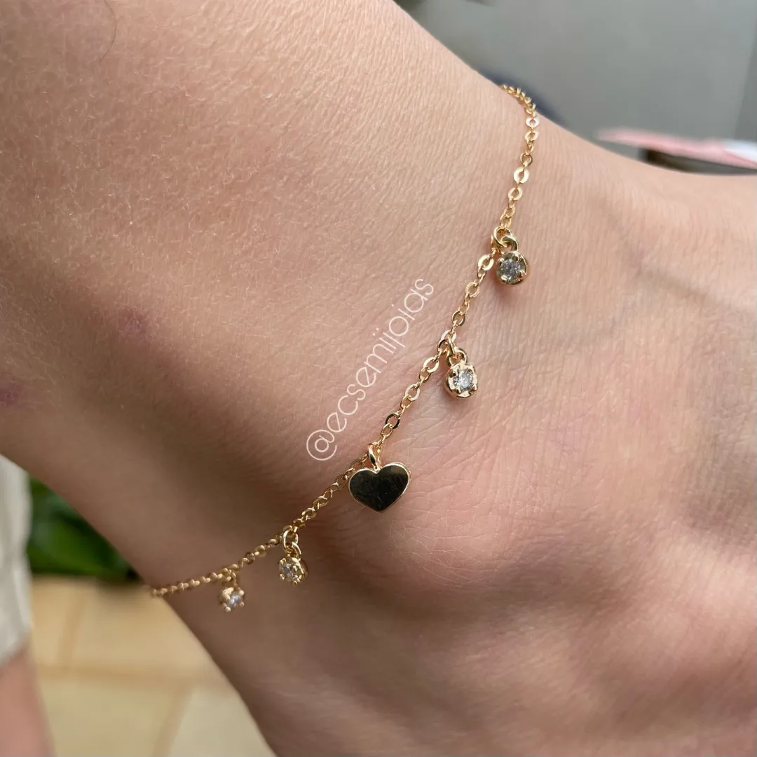 Tornozeleira com 1 coração liso no centro e 4 zircônias penduradas - 24cm + extensor - banhado a ouro 18kConfira opiniões e avaliações de clientes!